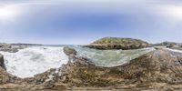 a 360 - lens image of the ocean and rocks on the shore of a beach