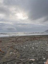 This image captures the beautiful coastal landscape at dawn in California, USA. The grey sky and gloomy atmosphere set the mood for the photo. The rocky shoreline is surrounded by the foggy ocean and waves crashing against the beach. The open space and wild surroundings create a natural and serene environment. The muddy surface and gravel add texture and depth to the scene. The horizon extends far into the distance, showcasing the highland and wilderness. This photo represents the untouched beauty and tranquility of California's coastal region.