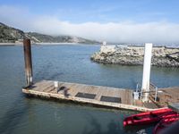 This image captures the picturesque coastal view of California, USA. The photo shows a high wooden bridge extending over the ocean, with clear skies and fluffy clouds above. Below the bridge, a boat is seen sailing on the calm waters. The landscape features a lake, surrounded by woodlands, creating a serene and natural setting. In the distance, a pier and harbor can be seen, serving as a hub for water-based activities and transportation. The elevated wood flooring of the bridge adds an architectural element to the scene. This photo portrays a beautiful day along the California coast.