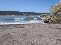 This is an image of a coastal headland in California, USA. The clear sky above contrasts with the sandy beach and the sparkling water of the ocean. The headland is formed by cliffs and crags, creating a stunning profile against the horizon. The calm surface of the sea and the foreground of the image add to the serene atmosphere of this beach. This photo represents a beautiful day on the California coast.