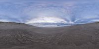 a fish eye view of an empty sandy area with hills in the background and a cloudy sky