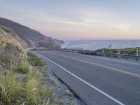 This stunning image captures the scenic beauty of the Pacific Coast Highway in California, USA. The photo was taken at dawn, showcasing the clear sky and the highway winding along the coastal terrain. The road surface, made of asphalt, contrasts with the lush grass and rugged mountains in the background. The image also features the sparkling waters of the Pacific Ocean and the towering cliffs. In the distance, contrails can be seen against the clear sky. This photo represents the emotional experience of driving through the breathtaking landscapes of Big Sur along the Pacific Coast Highway.