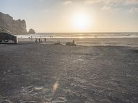 A peaceful California dawn at the low coastal dunes. The fog rolls in from the ocean, creating a gloomy atmosphere. The shoreline stretches as far as the eye can see, with the grey sky casting a soft glow. A perfect destination for recreational activities by the beach.
