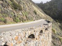 This image showcases the breathtaking landscape along the Pacific Coast Highway in California, USA. The high coastal cliffs, water, and mountains create a stunning backdrop. The road, with its elevated Armco barrier, curves along the coastline, providing a thrilling drive. The rock formations and outcrops exhibit the unique geology of the area. From the bridge, you can see the expansive ocean and clear blue sky. This photo captures the natural beauty and impressive infrastructure of the Big Sur region in California.