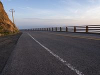An empty highway near the mountains along the California coast. The clear sky and bright dawn create a stunning landscape. The motorcycle drives across the road with the ocean as a backdrop.