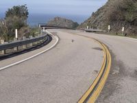 a motorcycle is driving down an empty winding road on a cliff side overlooking the ocean