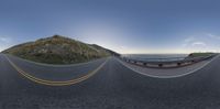 fish eye lens of a winding road, on an island by the ocean at sunset