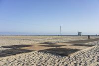 A serene coastal landscape in Santa Monica, California. The sandy beach stretches towards the calm ocean, with a wooden boardwalk and pier reaching out into the calm waters. The open space offers a natural environment for walking and enjoying the picturesque horizon.