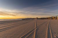 At dusk, two tracks lead towards the ocean on a sandy beach in Los Angeles, California. A resort sits in the distance, overlooking the coastal landscape. The evening sky is adorned with clouds, contrasting with the open space and water surface.
