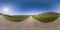 A breathtaking coastal landscape in California, with mountains in the distance and a sandy beach lined with houses. The open road leads to a lush green wilderness, while the clear sky reflects on the calm ocean. The perfect vacation spot for nature lovers.