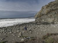 A view of the coastal landscape in Big Sur, California. The rocky shoreline and cliffs offer a stunning backdrop to the open space and dirt roads. With the Pacific Ocean as the backdrop, this scenic spot along the Pacific Coast Highway is a nature lover's paradise.