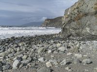 This image captures the scenic coastal landscape of Big Sur, California. The picture showcases the rugged beauty of the Pacific Coast Highway, with its winding road surrounded by open spaces, cliffs, and rock formations. The view overlooks the ocean, revealing the clear blue waters and the sandy beaches below. The rocky shore and the bedrock surface add depth and texture to the scene. The cloudy sky above completes the picturesque setting. This photo represents the natural beauty and geology of the California coastline.