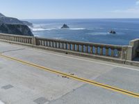 This is an image of the Bixby Creek Bridge, a concrete bridge located on the Pacific Coast Highway in Big Sur, California. The bridge spans across the scenic coastline, providing a beautiful view of the ocean and the surrounding landscape. The road, made of asphalt, runs alongside the ocean, lined with guard rails and a concrete barrier. The clear sky and the natural beauty of the area make it a perfect vacation destination. This photo captures the essence of the coastal architecture and the stunning nature of Big Sur, California.