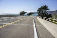 the view down a highway to the ocean from the top of a bridge with a line of yellow stripe in the center