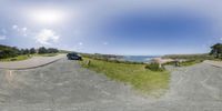 A low coastal road in California winds through a landscape of open space and evergreen forests. The road leads to a parking lot by the ocean, with a van parked on the side. Clear skies and grass-covered terrain make it an ideal vacation spot.