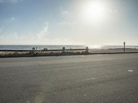This is an image of a coastal road in California, USA. The asphalt road is flanked by sand and the calm waters of the ocean. The photo was taken during the day, at dawn, when fog is visible in the distance. The clear sky and the horizon create a peaceful and serene atmosphere. The infrastructure includes a guard rail and an Armco barrier. On a gloomy day with a grey sky, the sun is visible, creating a contrast between the sunny and gloomy elements. This photo captures the beauty of the California coastline.