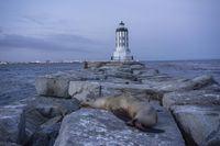 This is an image of the tranquil dawn atmosphere in Los Angeles, California, USA. The coastal landscape features an open space with calm waters and the vast ocean stretching into the horizon. A picturesque promontory with rocks and a pier adds to the beauty of the scene. In the distance, a lighthouse stands tall on a breakwater, guiding ships into the harbor. The clear sky complements the serene atmosphere. As the first light of the day breaks, a curious seal emerges from the marine mammal life below. This photo captures the peaceful coastal ambiance of Los Angeles at dawn.
