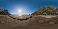 fish eye lens in view of the ocean and land at dusk or sunrise with boats floating near and people on the beach at the shoreline