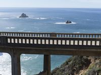 a bridge crosses over a beach towards the ocean and mountains near an ocean view area