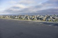 a gravel wall along the ocean is shown in this photo and is shown above an empty parking lot