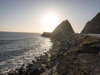 A stunning view of the California coastline at dawn. The Pacific Coast Highway runs along the elevated cliffs, with the open space and clear skies providing a beautiful backdrop. The sun is visible, casting a golden glow on the ocean and shoreline.