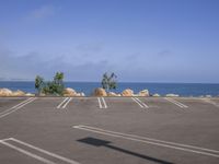 a parking lot that looks empty and empty in front of the ocean, next to some rocks