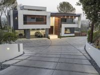 A modern home in Los Angeles, California, with a sleek concrete facade and a large driveway leading to the front entrance. The property offers a stunning view of the neighborhood below. Clear skies enhance the architectural beauty of this residential area.