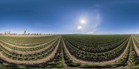 there is a sun shining in the distance over this crop land by a truck in this panorama