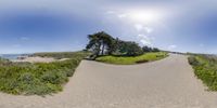 A wide-angle fish-eye lens captures the beauty of a curved road in California. The road winds through a picturesque landscape of mountains, forests, and coastal areas. The clear blue sky and lush vegetation add to the natural beauty of the scene.