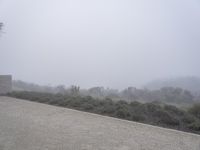A rural landscape in California at dawn. The grey sky and gloomy atmosphere create a haze over the vineyard. The road surface is covered in dirt and gravel, adding to the natural, untouched feel of the scene.
