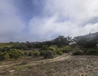 A rugged off-road track in rural California. The landscape features a mix of sand, dirt, and gravel, with vegetation and shrubs scattered throughout. The cloud-filled sky adds a dramatic touch to the scene.