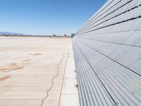 A clear day at an airport in California, USA. The metal blastwall provides a sturdy surface along the airfield. The concrete walls line the airport, contrasting with the clear sky above.