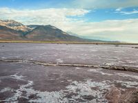 This is an image of a muddy lake in California, USA. The open space is surrounded by mountains in the distance. The water levels in the lake are low, exposing the salt surface and revealing a dead tree in the middle. The cloudy sky adds to the atmosphere of the picture. This photo captures a typical day in California, showcasing the unique landscape and open spaces of the state.