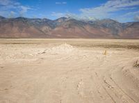 A rugged off-road track in the California desert. The sky is filled with clouds, contrasting with the barren landscape. Construction vehicles can be seen on the dirt and gravel surface.