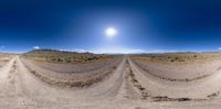 three view - panoramic photographs of desert field under sunray, taken from vehicle