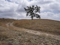 This stock photo features a stunning California desert landscape. In the foreground, there is a large tree standing tall on top of a hill. The hill is surrounded by a dry grass field and a dirt road winding through the scenery. The blue sky with scattered clouds provides a serene backdrop to this natural environment. This image perfectly captures the rugged beauty and vastness of the California desert, making it ideal for nature and landscape enthusiasts.
