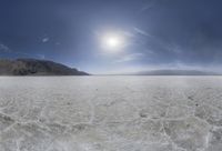 large mountain range sitting above desert, with sun in sky and clouds overhead on sunny day