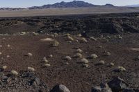 large and small rocks in the middle of the desert landscape with large rocky mountains in the background