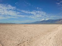 A scenic view of the California desert with mountains in the background. The rugged landscape features dirt roads and open spaces. The sky is clear with cumulus clouds on the horizon. Vegetation is sparse, and the ground is covered in sand and gravel.