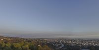 This is an aerial view of the city of Los Angeles, California, USA. The photo captures the city skyline at dawn, with skyscrapers towering over the open spaces and tree-covered hills. The plain stretches out towards the horizon, creating an impressive atmosphere. The clear sky enhances the beauty of the cityscape, providing a breathtaking overlook of the valley below. The photo showcases the elevated view of the urban landscape, with a hint of haze in the distance. This image represents the charm and grandeur of Los Angeles at break of day.