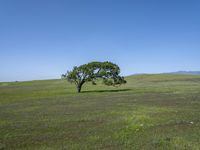 This is an image of a lush green field in California, USA. The open space and clear sky create a beautiful natural environment. The field is covered with vibrant grass vegetation and scattered trees. This rural landscape represents the beauty of the California countryside. It showcases the agricultural richness and pastoral scenes that can be found in this region. The image captures a peaceful day in the countryside, making it a perfect representation of the rural landscapes of California.