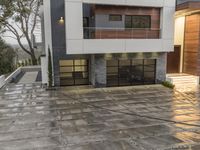 A modern architectural masterpiece in Los Angeles, California. This high-rise residential building features a wet driveway, with a parked bike and open spaces. The elevated villa boasts stunning views of the city and a concrete surface.