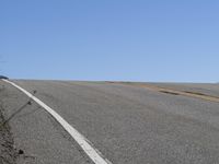 A scenic view of a low mountain road in California with a clear sky. Lined with trees, the asphalt road stretches towards the horizon. Experience the beauty of California's nature.