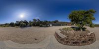 a fish eye lens photo of a house and tree in a yard with rocks and plants