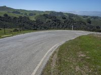 This is an image of a road in California, USA. The asphalt road winds through a picturesque landscape, surrounded by mountains, grassy fields, and lush green hills. The rural setting is peaceful, with clear skies overhead. The highland curves and elevated road surface add visual interest to the scene. This photo captures the natural beauty of California's wilderness and the infrastructure that allows for travel through it. It is a perfect representation of a day spent exploring the highland roads of California.