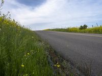 A gloomy day in rural California. The grey sky contrasts with the lush green grass and fields of yellow flowers. The asphalt road cuts through the picturesque landscape, highlighting the natural beauty of this prairie.