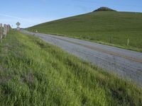 This is an image of a road in California, USA. The asphalt road winds through a picturesque landscape, surrounded by lush green grass, hills, and pastures. The rural scenery showcases the natural beauty of the area. The clouds in the sky add depth to the overall view. The vegetation and fields reflect the agricultural importance of the region. This photo captures the elevated and lush natural environment of California's prairies and croplands.