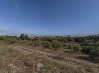Rugged California landscape with a sprawling open field and small bushes. The clear sky and vast horizon make for a picturesque day. Off-road track and dirt road add to the natural charm of the rural scenery.