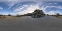 this is a fish eye lens photo taken on the side of a road with a very large rock on one side,