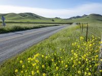 A picturesque California landscape on a sunny day. The road winds through lush green hills and fields of vibrant yellow canola flowers. The elevated vantage point offers a stunning view of the natural environment.